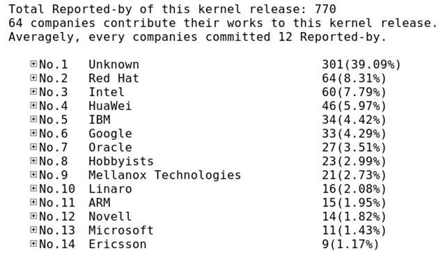 以公司为维度来看,中国的华为公司对Linux的贡献度排在第三位(注: 第一名属于未知范畴,不算有效公司名,其排序参见下图)。