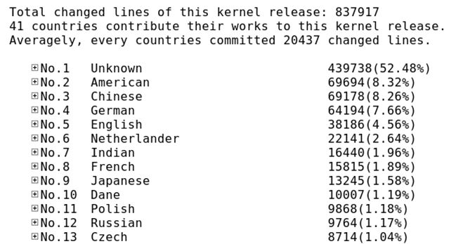 我们拉取了Linux内核贡献度超过1%的国家统计数据,发现:美国第一,中国第二(注:第一名未知范畴,不作为真实有效国家)。