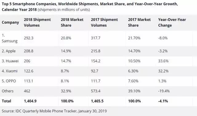 IDC市场研究数据显示,2018年全球智能手机全年总出货量为14亿部,同比下降4.1%;2019年Q1出货量继续下跌,仅为3.1亿部,这也是全球智能手机出货量连续第六个季度出现下滑。同时,IDC预测2019年全年出货量将继续下滑0.8%,降至13.9亿部。