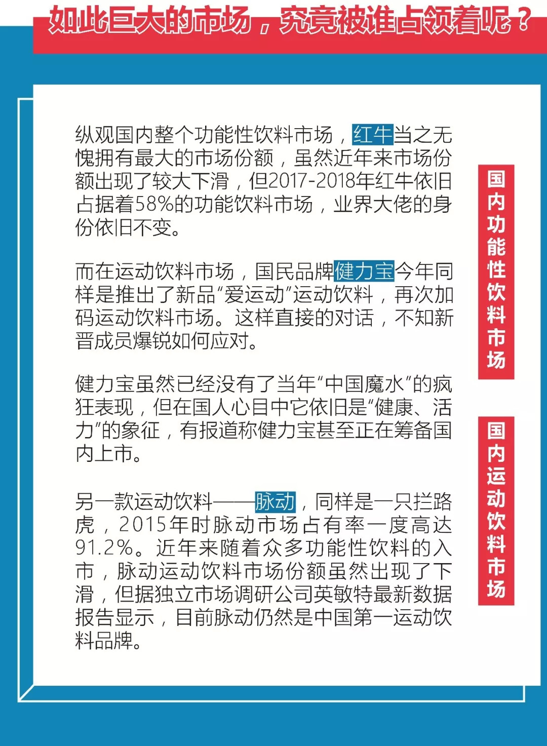 而据最新消息披露,国内功能饮料市场的“老二”东鹏特饮已接受上市辅导,开启了上市征途,这同样将对爆锐的布局形成巨大冲击。