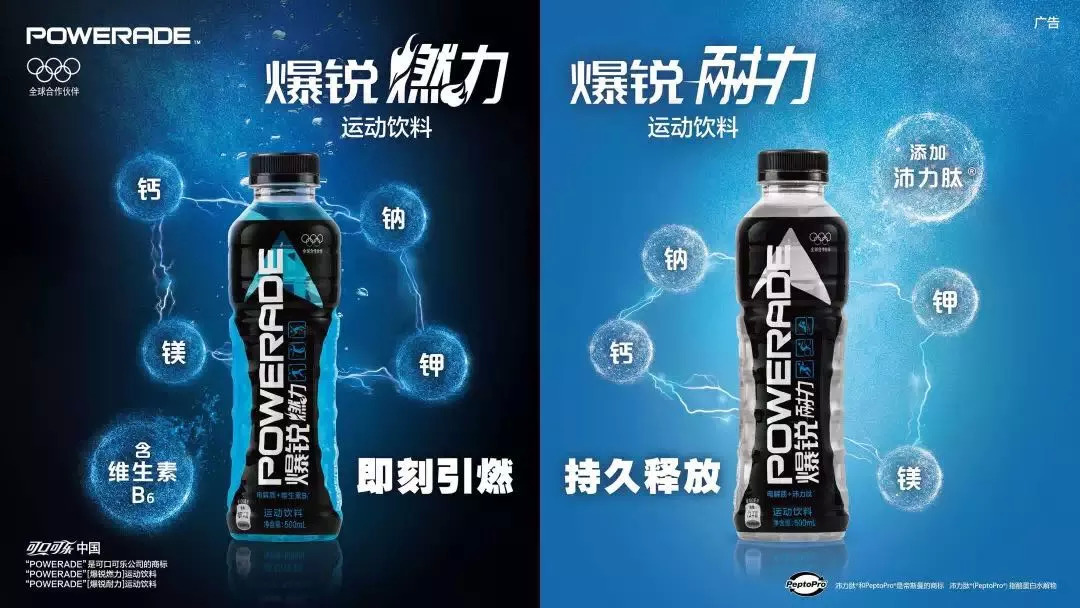 曾经的“动乐”(POWERADE)失败了,可口可乐此番入局直接改头换面为爆锐,从气势上就得到了提升。