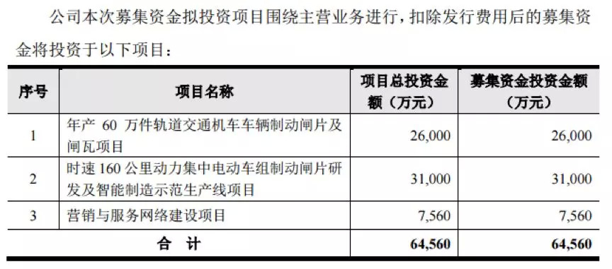 根据招股书,公司拟募集资金6.456亿用于年产60万件轨道交通机车车辆制动闸片及闸瓦项目、时速160公里动力集中电动车组制动闸片研发及智能制造示范生产线项目及营销与服务网络建设项目。