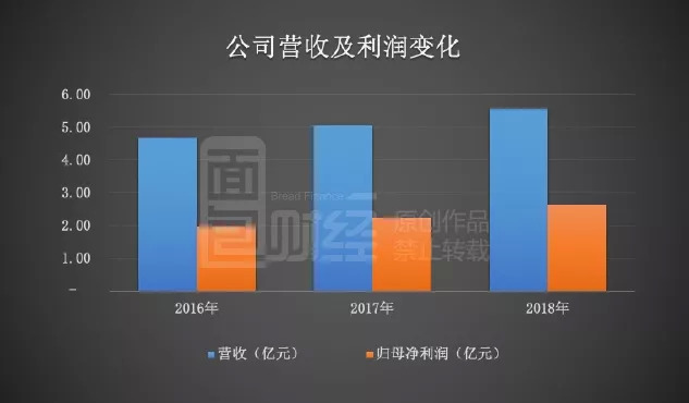 财报显示:2016-2018年,公司营业收入分别为4.68亿元、5.07亿元及5.58亿元,归母净利润分别为1.95亿元、2.22亿元及2.63亿元。