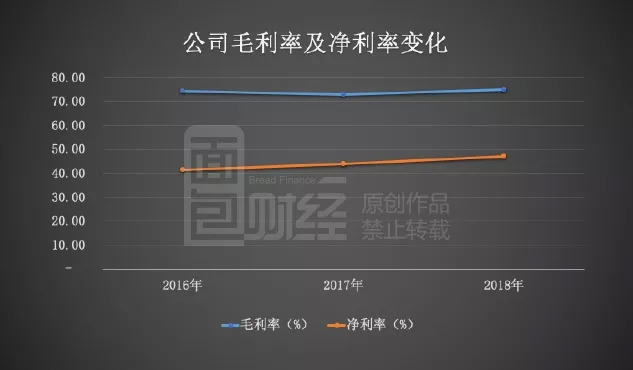 财报显示:2016年度、2017年度及2018年度,公司综合毛利率分别为74.32%、73.12%和75.11%,维持在较高水平。
