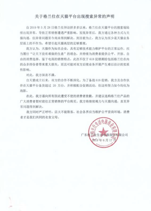腾讯新闻《一线》消息,广东格兰仕生活电器商业有限公司发表公开声明称,自2019年5月28日格兰仕拜访拼多多以来,格兰仕在天猫平台的搜索端陆续出现异常,导致正常销售遭遇严重影响。格兰仕称,发现异常后,公司通过各种方式与天猫沟通,但异常问题至今尚未得到解决。到目前为止,格兰仕认为至少是天猫业务层面上的不作为,希望引起天猫高层的足够重视。