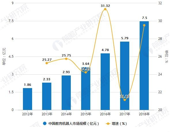 近几年,STEAM教育一直在升温,教育机器人自然也成为了各家追捧的热点。据前瞻产业研究院调研数据显示,2018年中国教育机器人市场规模约为7.5亿元,较上年增长29.53%,近5年来,中国教育机器人市场始终保持20%以上增速快速增长。行业规模有望突破18亿元。