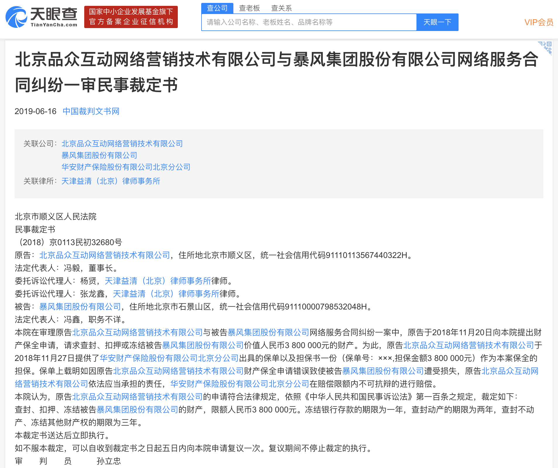 天眼查6月16日显示,暴风集团新增一条裁判文书,详细为暴风集团与北京品众互动网络营销技术有限公司就网络服务合同纠纷的一审民事裁定书。