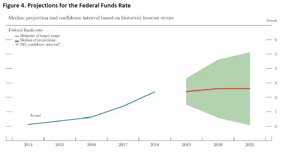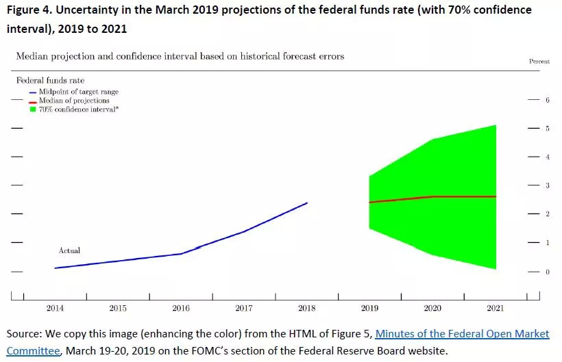 自2017年以来,FOMC还在完整的SEP中发布一份图表,帮助人们直观地看到利率走势的不确定性。图4再现了2019年3月19日至20日会议纪要中包含的版本。这张扇形图清楚地表明,尽管中值显示未来两年多的政策利率变化不大(用红色表示),但随着预测范围的扩大,存在相当大的不确定性。