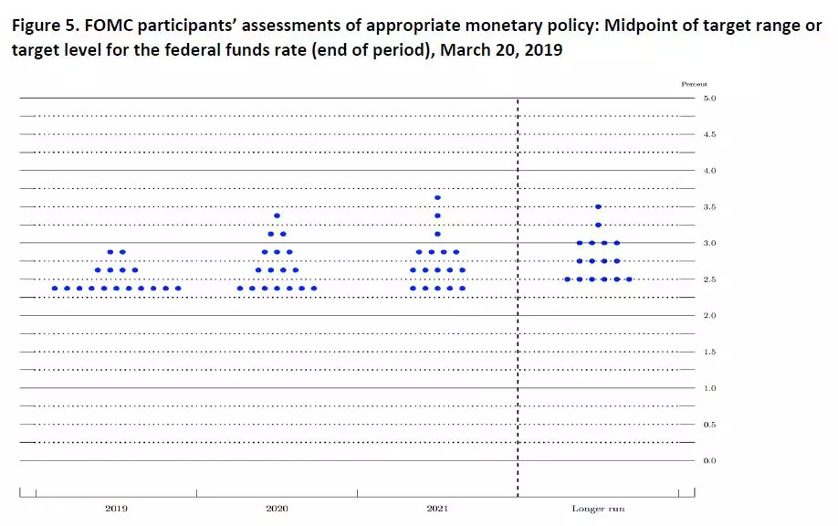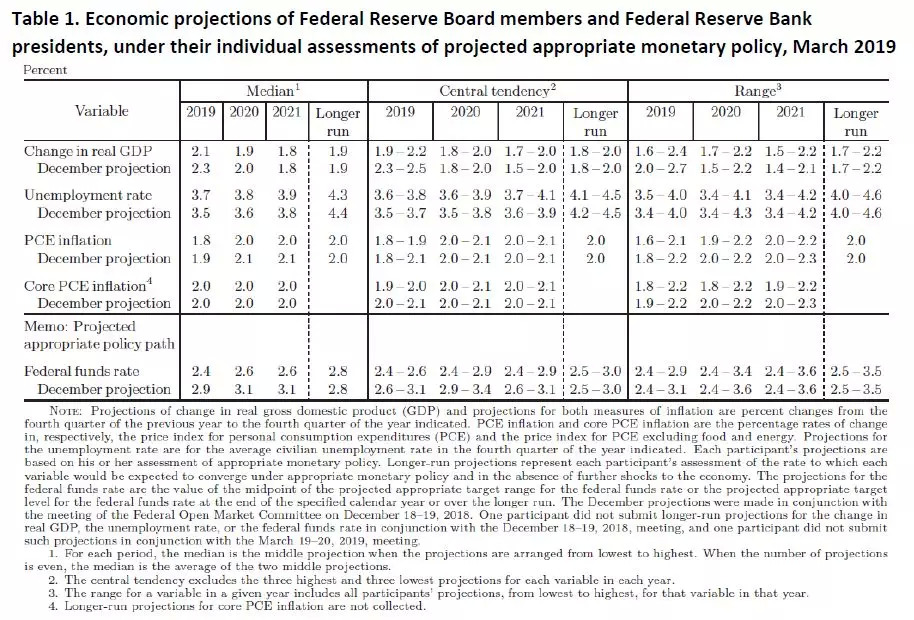 下面的表格和数据提供了FOMC参与者对经济和政策预测的更多细节。表1报告了2019年3月和2018年12月对2019年、2020年和2021年以及更长期实际增长、失业、通胀和联邦基金利率的预测中值、中央趋势和范围。图5显示了联邦基金利率的个别预测。表2报告了基于过去标准的误差范围,这些误差范围用于计算图1到图4中的阴影区域。表3是FOMC参与者的预测矩阵。