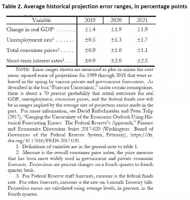 幸运的是,FOMC发布了大量关于不确定性的信息,但几乎没有引起人们对这项宝贵工作的关注。完整的SEP中的表2提供了对实际GDP增速、失业率、通胀和短期利率预测的误差范围的估计。由于这一信息出现在SEP首次发布的三周后,只有铁杆粉丝才会使用这些关键信息。