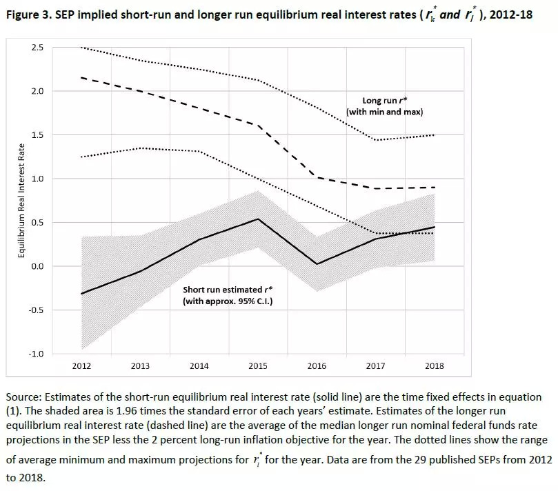 在2012年,r*k处于略低于零的水平,之后逐步上升,到2018年接近0.5%。这意味着,FOMC近期对利率、通胀和失业的预测与0.5%的短期利率一致。而在同期,长期利率r*l持续下降,从2012年的2%以上(1.25-2.5%区间)下降到了2019年3月的0.75%(0.4-1.5%区间)。