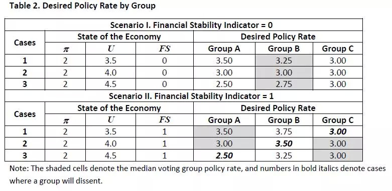 根据金融稳定指标是0还是1,考虑两种不同的场景。在每个场景中,唯一变化的是失业率。表2显示,情景1中,当FS(金融稳定指标)为零,组B始终是中位数(表中的阴影单元格)。此外,没有哪个组希望政策利率高于中位数25个基点,因此投票结果将是一致的。情景2中,当金融稳定担忧存在时,组B从来都不是中位数,中位数在A或/和C变动,而且在每个案例中都有反对情况(斜体表示):案例1中,组C表示反对,因为他们首要关注通胀,案例2中,组B反对,因为他们的模型暗示更紧的货币政策以应对金融稳定风险,案例3中,组A反对,因为他们首要关注失业。