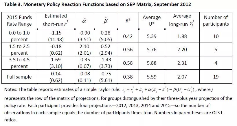 根据现有的公共信息,我们无法准确估计个人的反应函数。相反,为了勾勒出我们可能从整个矩阵中学到的东西,我们利用可用的稀疏信息,寻找可能对不断变化的经济状况做出类似系统性反应的群体。2012年9月的SEP报告了19个参与者的矩阵,并对2015年进行了预测,有76个观察结果。基于参与者对2015年联邦基金利率的预测,我们把数据分成三组:(1)2015年的联邦基金利率将在0-1.0%;(2)2015年的联邦基金利率将在1.5-2.5%;(3)2015年的联邦基金利率将在3.5-4.5%。以这些组为例,我们估计了三个简单的泰勒规则。结果见表3。注意,这三个组对短期利率的估计和对通胀和失业缺口的反应不同。