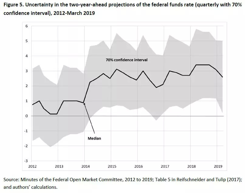 为了强调这些已公布的不确定性指标的价值,我们研究了截至2019年3月的所有30份SEP的信息,并将其与Reifschneider和Tulip(2017)计算的误差范围结合起来,得出FOMC未来两年政策利率预测的不确定性历史。