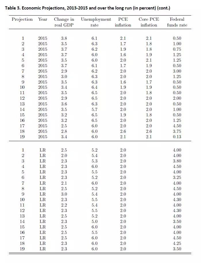 2012年,FOMC在SEP内增加了关于联邦基金利率的明确信息。当时,FOMC可能希望,展示对利率维持在接近于零的水平的广泛支持,将加强其“更长时间内保持低水平”的承诺。现在情况肯定已经不同了。