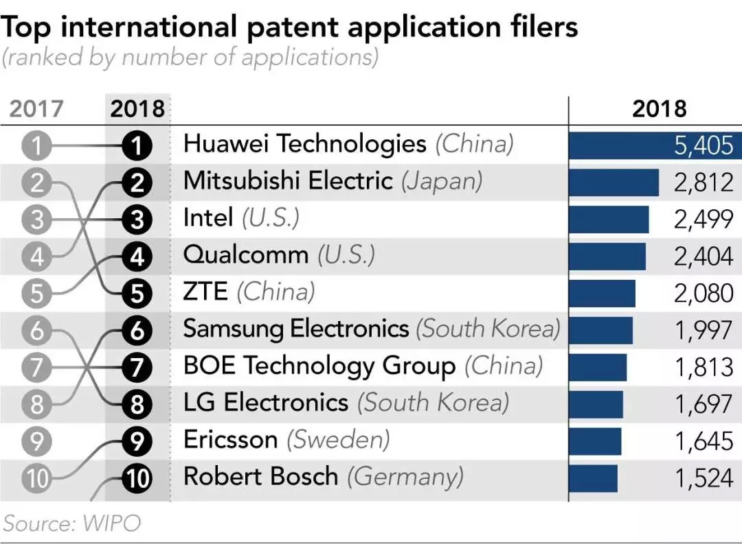 美国“彭博社”在一篇最新报道中承认:华为握有的大量“关键技术的专利”,确实是美国政府无法打压的一个优势。而且,华为所拥有的“关键技术专利”还多达56492个,总专利数更是有102911个。另外,在今年3月联合国下属的知识产权组织公布的一份关于2018年全年专利申请数据的报道中,也提到中国专利申请的总数为53345件,仅比美国56142件专利数少2797件,排名第二。从公司来看,华为公司则独占鳌头,以5405件专利申请量拿到了全球第一,占据着亚洲专利申请数量的一半,同时也创下知识产权组织历史上由一家公司提交的国际专利申请量的纪录。