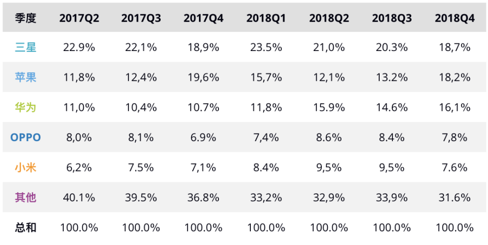 2017年Q2至2018年Q4全球市场智能手机市场份额变化