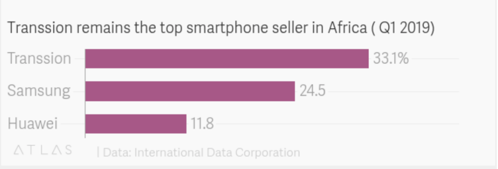 2019年一季度非洲市场智能手机市场排名前三品牌