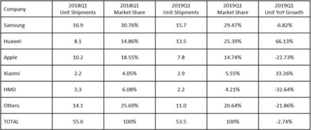 2019年第一季度,欧洲智能手机市场出货量为5350万台。最新的排名依次是三星、华为、苹果、小米、HMD。另外,这五个品牌中有三个出现了负增长,而华为和小米则呈现出了令人意想不到的成绩。