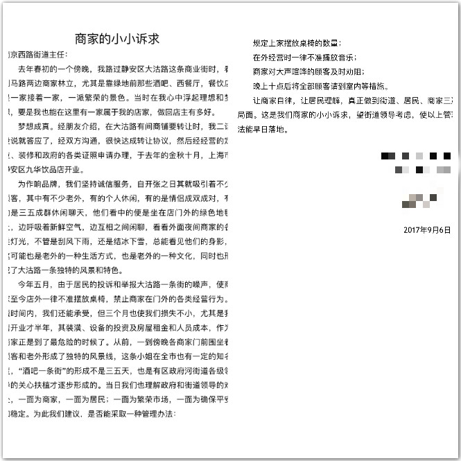 信中写到:“去年春初的一个傍晚,我路过静安区大沽路这条商业街,看到马路两边商家林立,酒吧、西餐厅,餐饮店一家接着一家,一派繁荣的景色。当时在我心中浮起理想和梦想,要是我也能在这里有一家属于我的店有多好。梦想成真,去年金秋十月,我的店开业。但是今年五月,由于居民的投诉和举报,使商家至今店外一律不准摆放桌椅,禁止商家在门外的各类经营行为。三个月使我们损失不小。”