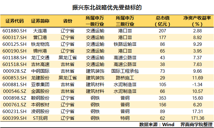 优先受益标的的统计标准为基础建设相关个股,由于振兴东北战略的推进需要大量前期资本投入,最先收益的行业为基建、交通、路桥、设计、建材类等。