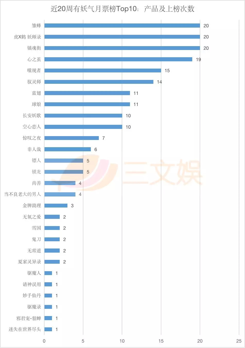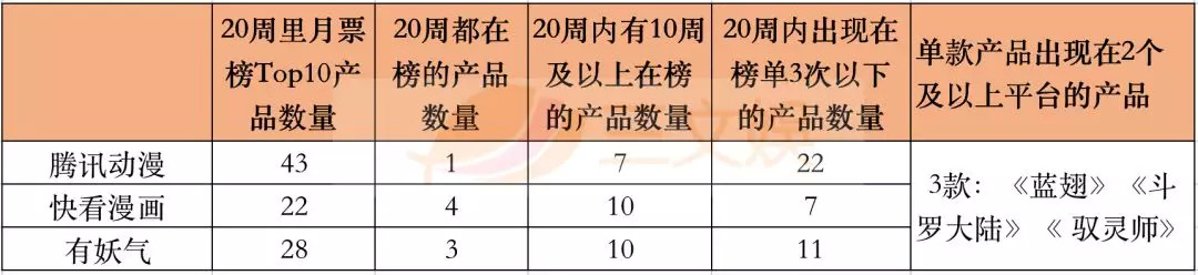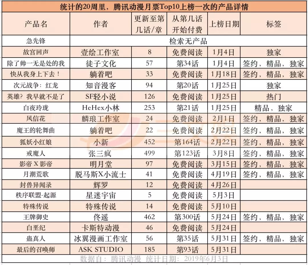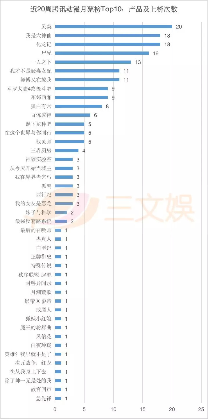 每周,腾讯动漫的月票榜都会清零。在统计的这20周时间里,月票周榜第一位的产品月票数在2000-6000张。