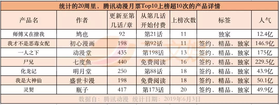 20周里,月票榜Top10出现超过10次的产品,都是腾讯动漫的独家作品。可预见的是,未来平台对于这类头部漫画作品的争抢,会愈发激烈。