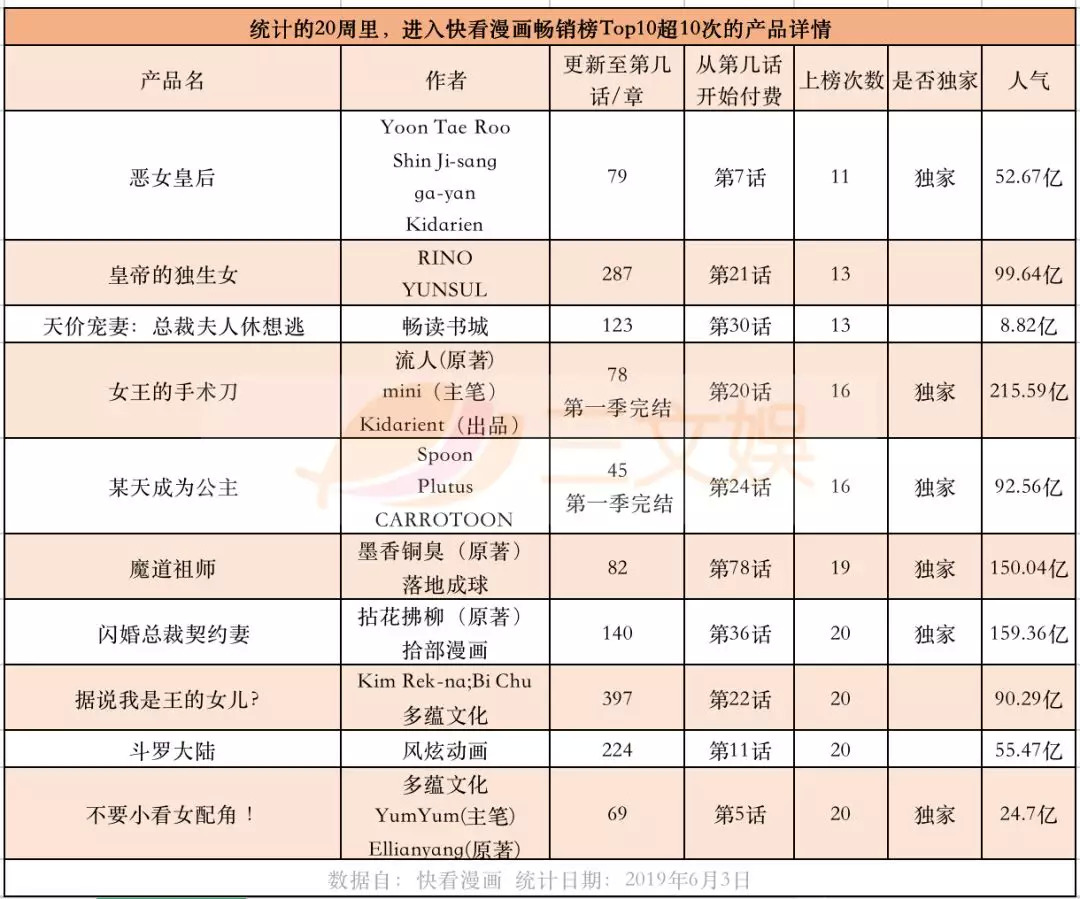 20周里,快看漫画畅销榜Top10的上榜产品有22款。