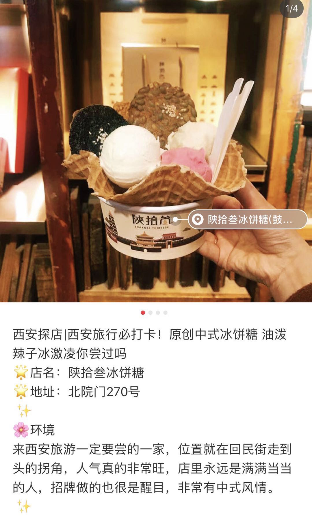 尽管在几年前,西安人还没有把毛笔酥当做本地特色,但并不妨碍它和诞生于仿古建筑群永兴坊的“摔碗酒”一样,成为吸引游客来西安的新鲜玩意儿。还有油泼辣子味道的冰淇淋,也成为了小红书最多的推荐,它似乎超过了肉夹馍和羊肉泡馍,成为年轻人到这座城市必须打卡品尝的美食之一。