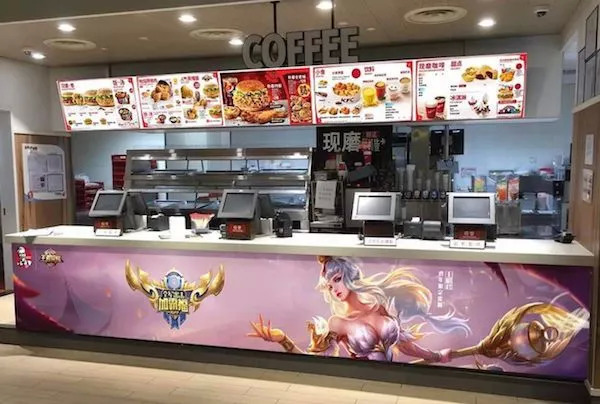 比如2015年肯德基与王者荣耀达成的战略合作,以“团在一起”的理念整合线上线下资源,实现虚拟内容的实体化场景呈现,将IP物料放到线下实体店中吸引玩家和朋友到店“开黑”,并携手《王者荣耀》发布主题套餐“人气荣耀餐”直接带动产品销售。