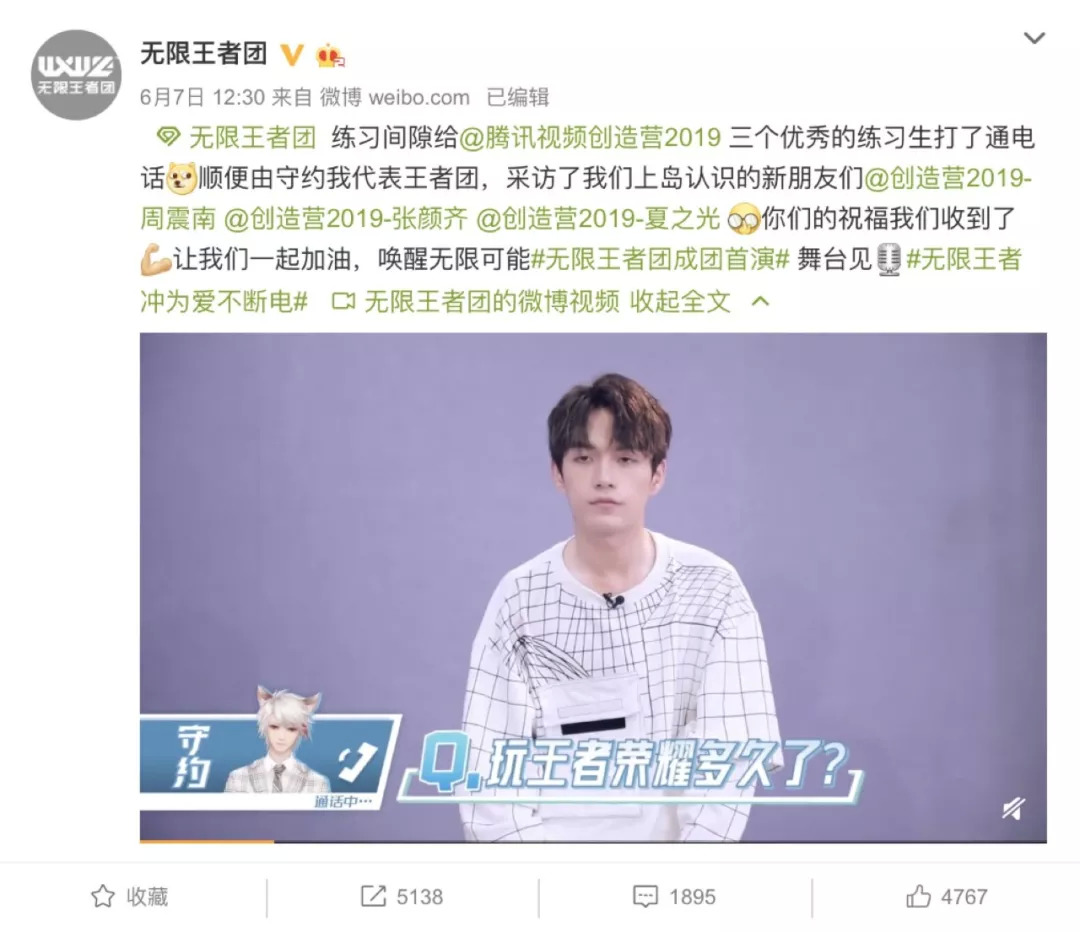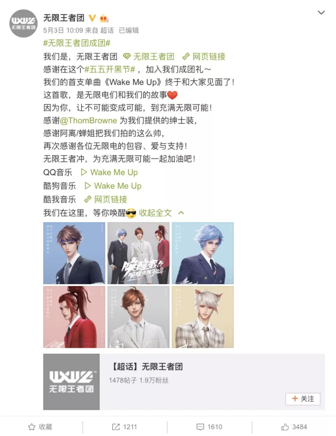 2019年五五开黑节前夕,国内头部电竞IP《王者荣耀》正式推出虚拟男团——无限王者团。借势时下最流行的男子偶像团体和出道话题为“TEAM”的价值观延伸出娱乐趣味,带动更多年轻用户的对游戏的关注。云、亮、白、信、守约五位团员分别有自己的个性和唱跳优势,聚合成团出道,并宣布团魂——唤醒无限可能。5月3日,出道同时带来了其首支单曲《Wake Me Up》,登上了QQ音乐内地榜首位与billboard中国音乐榜TOP100。并在6月,通过《创造营2019》舞台和AR技术支持实现出道后首场演出。