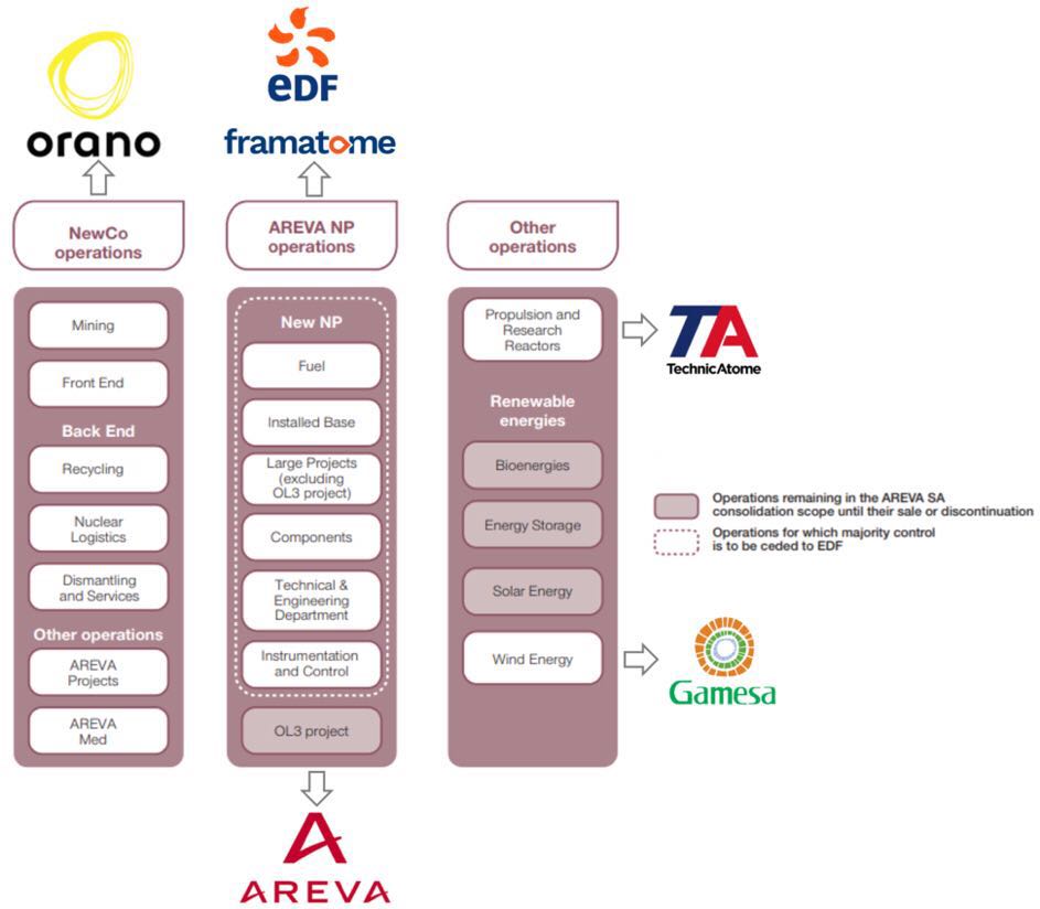 2016年6月15日,法国政府牵头并制定了阿海珐的重组计划:阿海珐反应堆业务(即阿海珐NP)75.5%的股权被法国电力以24.7亿欧元购得;核燃料循环为主的相关业务以新阿海珐(Areva NewCo)的名义另起炉灶,2018年初更名为欧安诺(Orano);核动力推进业务也被法国国家参股管理局接手。