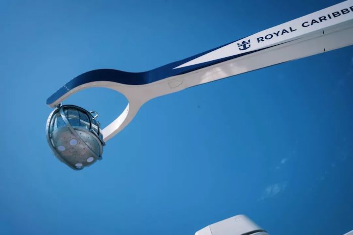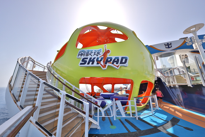 位于15层甲板的边缘,有一个直径13米的球体空间,这就是光谱号打造的VR蹦极体感游戏的南极球(Sky Pad)。球体外是悬空的玻璃步道,球内有4个蹦极床,可以戴上VR眼镜体验其中“机器人拉力赛”、“糖果跳跃赛”和“贝斯保镖”三款全新的游戏。
