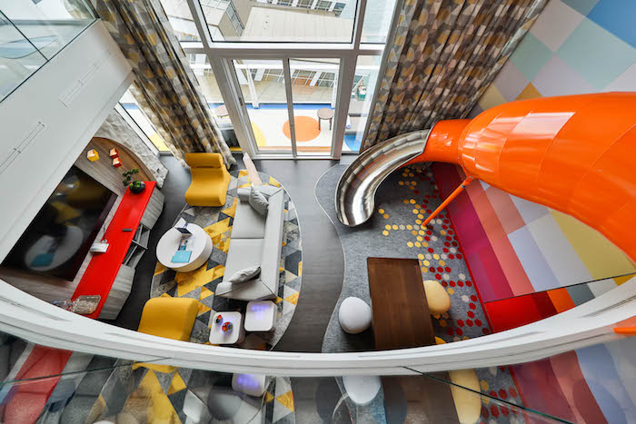 一进房间一个橘红色的滑梯,绝对是吸引所有人眼球的装置。因为房间足够大,大到可以从2层到1层滑滑梯下来,就算是大人,也会和孩子“打架”体验一下这个滑梯吧。