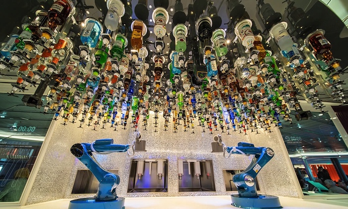美食体验过后,美酒也不能忽略,包括悦音厅、精致酒廊、北极星酒吧等。最具亮点的要属机器人酒吧,机器手臂在90秒内自动化的调制出你想要的那款酒,当然了它还能根据你自己的喜好创新一杯“你的专属”。等它调制好后,你的名字就会出现在大屏幕上,扫描手机二维码,便可拿到“你的专属”了。你看,它多智能。