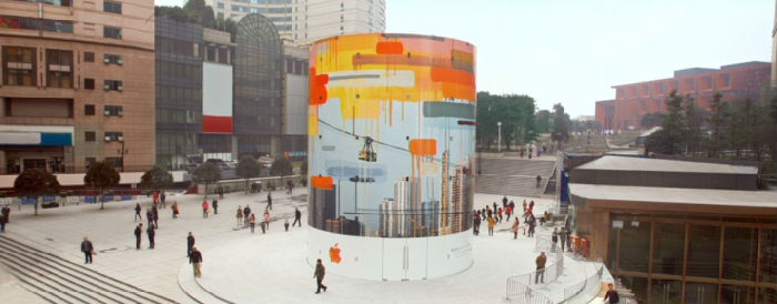 重庆的苹果门店围挡也一度引起热议,这家门店的围挡被做成环形,围挡上的艺术作品是由重庆出身的艺术家潘阳阳和摄影师Navid Baraty共同制作的:Navid Baraty用镜头将重庆朝天门等本地景色记录,潘阳阳在照片上进行再创作。