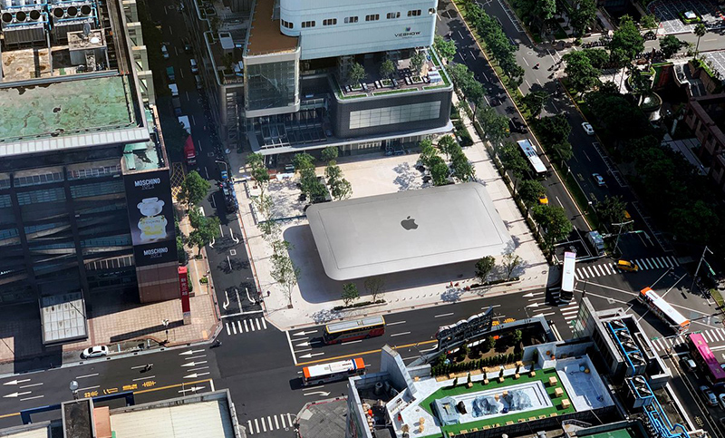 苹果在台北的第二家门店“Apple信义A13”近期正式开业,地址在台北最繁华的信义区松寿路地段。这家门店的屋顶和结构设计也延续了苹果的特色:代表性的玻璃幕墙上是一块巨大的有延伸感的屋顶外盖,内部减少承重柱,视觉效果通透;俯视图则更有趣——看起来就是MacBook的样子,且屋顶和MacBook外壳的材质一样,都是以碳纤维材质做成的。
