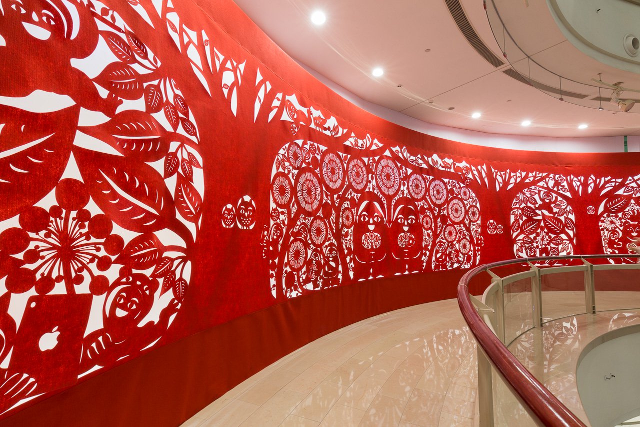 苹果在台北的第一家门店开业就与台湾剪纸艺术家杨士毅合作。杨士毅为苹果店的外围制作了长达75公尺的传统剪纸,这套剪纸则与灯光等其他设计一起,将苹果店的外围包装起来。新店开业的文案在当时也颇有人情味——“有闲来坐”,这是台湾人家常中的口头禅,在艺术家杨士毅的讲述里,苹果用这个词一方面是为了释放对台湾消费者的善意,邀请人们来苹果门店内相聚;另一方面也配合了剪纸上有家庭、动物、团聚的图案素材。