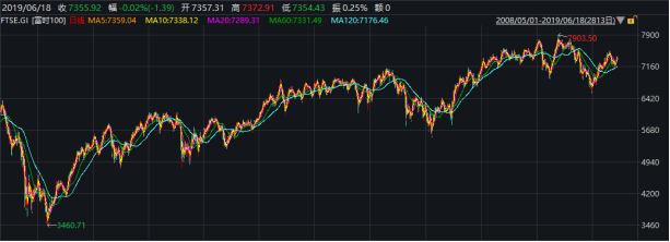 从走势来看,富时100指数曾在2018年5月达到7903.5的高点,随后震荡下行,2019年以来势头迅猛,截至6月18日的年内涨幅近10%。
