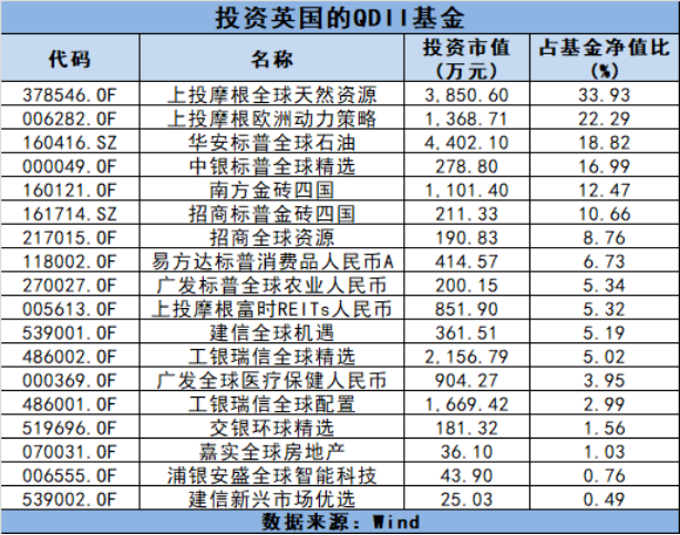 据wind数据显示,截至2019年一季度末,英国是QDII基金在境外32个国家中投资市值排名第九的国家/区域,目前共有18只QDII基金配置了英国区域,投资市值合计1.82亿元。