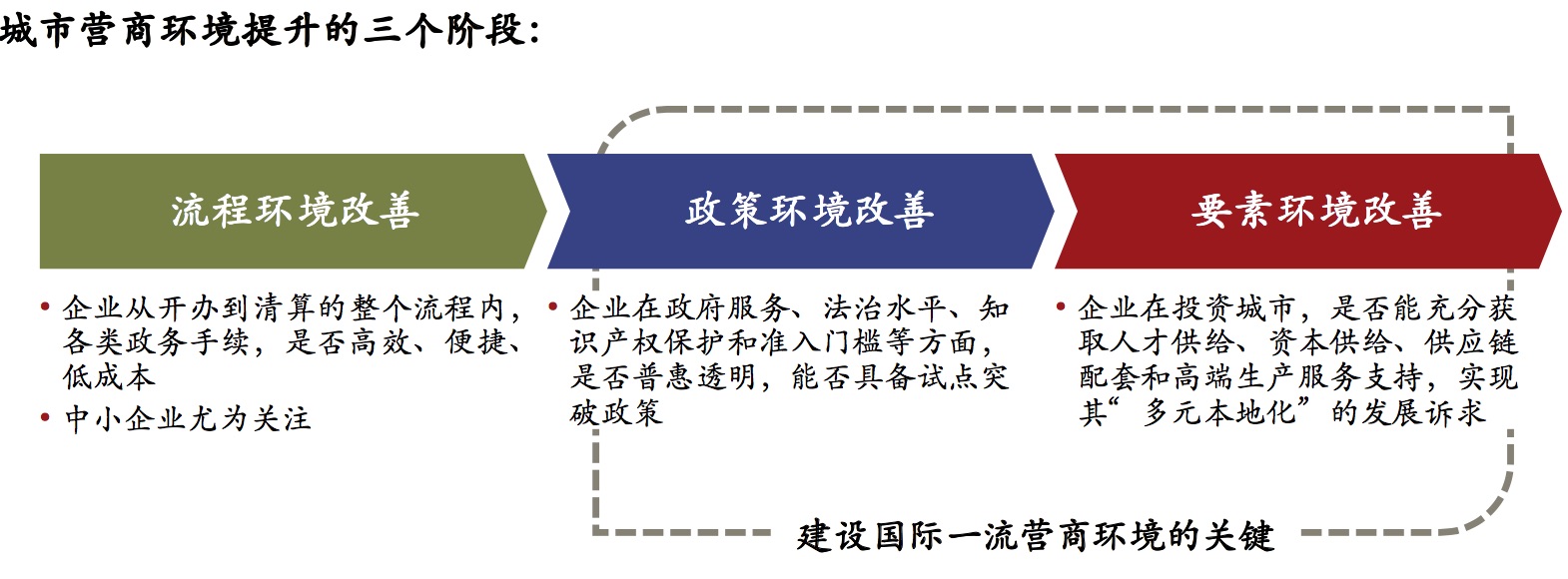 科尔尼认为,城市营商环境提升有三个阶段:第一阶段是流程环境改善,即企业从开办到清算全流程是否经济高效;第二阶段是政策环境改善,即企业在政府服务、法治水平、知识产权保护和准入门槛等方面,做到普惠透明;第三阶段是要素环境改善,即在人才供给、资本供给、供应链配套和高端生产服务支持等方面,做到有效供给。而对一二线城市而言,政策环境和要素环境的改善,对于打造国际高水平营商环境,吸引国际级企业机构,更为关键。