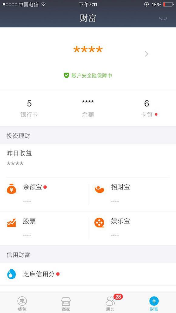 新支付宝把所有的金融理财功能都集中到了“财富”页面,包括余额宝、招财宝、股票、娱乐宝,甚至芝麻信用。
