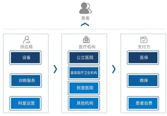 医学影像产业链最终的服务对象是患者,供给方分为三个部分,医疗机构是产业链核心,上游是其供应商,下游是支付方。