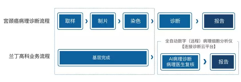 以宫颈癌病理诊断起家的兰丁高科,从2016年开始建设独立第三方病理诊断中心,同时打造了宫颈癌诊断云平台。基层宫颈癌病理诊断受制于病理医生匮乏,兰丁高科通过全自动数字(远程)病理细胞分析仪,实现细胞病理玻片的自动数字化,然后将影像远程传至诊断云平台,由AI和专家完成影像诊断并出具结果。