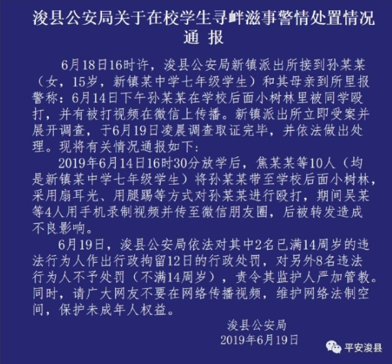 河南省浚县公安局发布通报,6月18日16时许,浚县公安局新镇派出所接到孙某某(女,15岁,新镇某中学七年级学生)和其母亲到所里报警称:6月14日下午孙某某在学校后面小树林里被同学殴打,并有被打视频在微信上传播。新镇派出所立即受案并展开调查,于6月19日凌晨调查取证完毕,并依法作出处理。