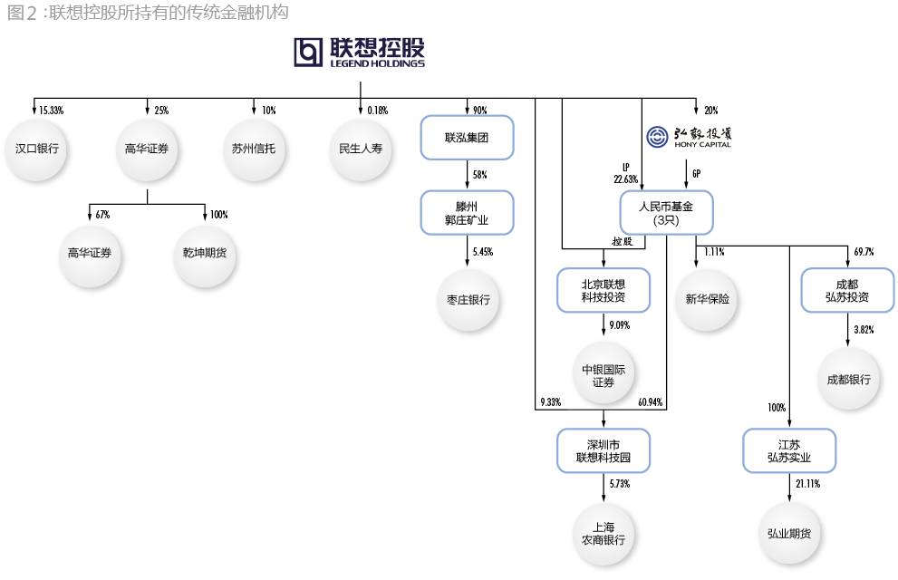 从架构来看,联想系所持有的金融机构主要分成两大块:一块是联想控股直接持有的,包括汉口银行、高华证券、苏州信托、民生人寿等;另一块是通过弘毅投资所持有的,包括成都银行、中银国际证券、上海农商银行、弘业期货等。