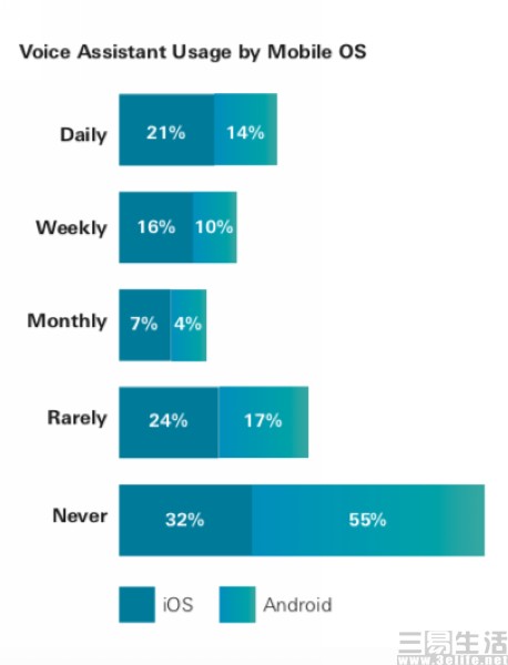 不过经过了近8年的发展,语音助手却并没有成为炙手可热的功能。日前,根据商业调查机构SUMO Heavy对超过1000名美国成年人调查出具的白皮书显示,46%的受访者从不使用语音助手,19%的受访者表示很少使用语音助手,这两个群体共占65%的调查样本,而29%的受访者表示,他们每周或是每月都有使用语音助手,是这一功能的活跃用户。而无独有偶的是,另一家调研机构Uberall,在今年4月公布的消费者调查显示,有高达52%的受访者从不使用语音助手功能。