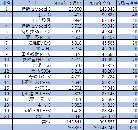 在2018年全球电动汽车销量榜上,特斯拉的Model 3是当之无愧的王者,全年销售14.58万辆(其中12月单月2.5万辆),占全球电动车销量的7%。但值得注意的是,全球销量前20名的车型中,有11款中国车,其中有5款来自比亚迪。