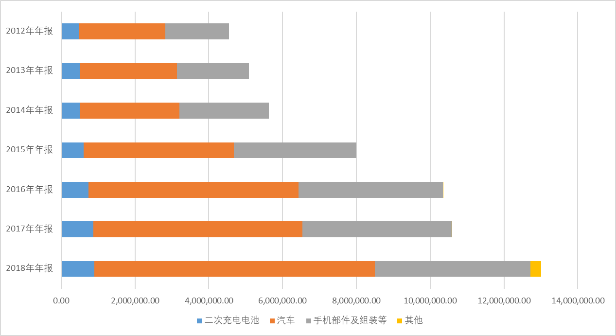 从营收构成看,公司核心业务包括三大部分,二次充电电池、汽车和手机部件组装。