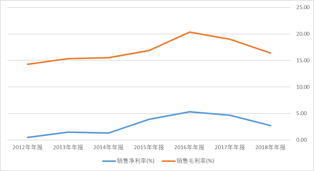 最重要的原因是公司毛利下降了,据公司年报,2018年,公司的毛利率为16.4%,较上年同期下降了2.61个百分点。2018年,公司的净利率仅为2.73%。